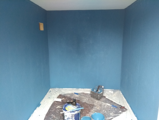 De betonnen vloer was lelijk en op sommige plekken flink beschadigd. Ik heb daarom na de plastic tegels besloten om de vloer te egaliseren. Na het aanschaffen van een aantal zakken egalisatie en het te verspreiden over de vloer gaf dit een mooi resultaat. Helaas heb ik hiervan geen foto's gemaakt. Na het egaliseren heb ik de vloer geverft met witte verf zodat wanneer ik dingen laat vallen ik ze makkelijk kan zien. 2020-10-18
